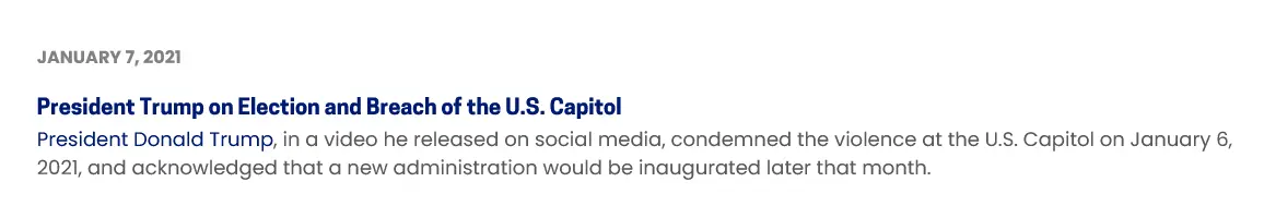 President Donald Trump, in a video he released on social media, condemned the violence at the U.S. Capitol on January 6, 2021, and acknowledged that a new administration would be inaugurated later that month.www.c-span.org