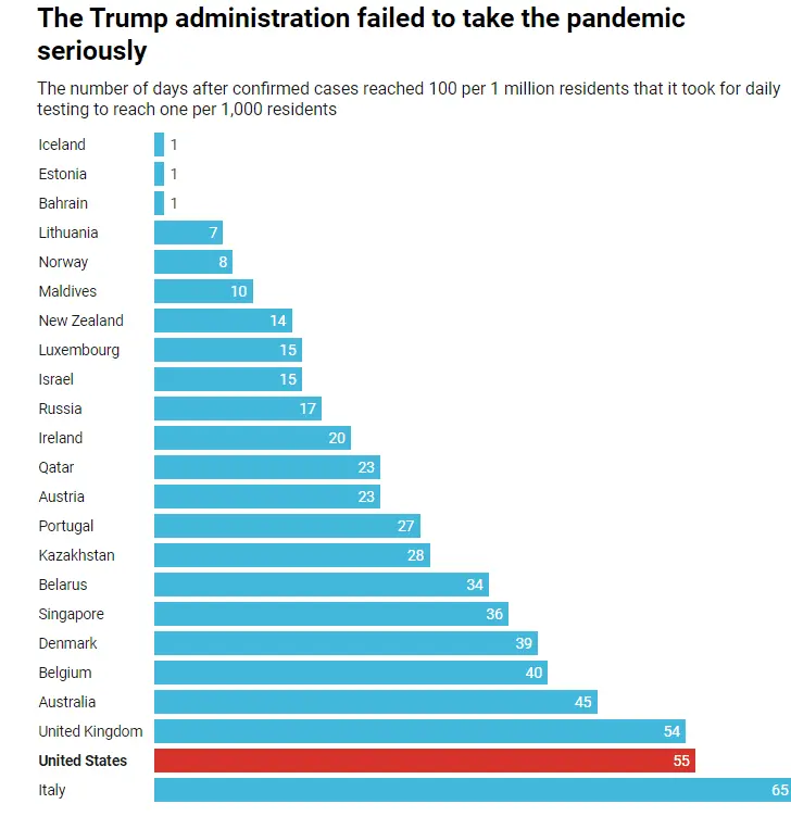 The Trump administration failed to take the coronavirus outbreak seriously. In late February, while other high-income countries were ramping up testing and developing tracing procedures, President Donald Trump stated that “the Coronavirus [was] very much under control.” It was during these critical early weeks and months that the United States should have been stockpiling protective gear for frontline workers and making testing widely available. In contrast, South Korea, a country whose first confirmed case of COVID-19 coincided with that of the United States, bought 720,000 masks for employees of businesses considered at risk of exposure to the coronavirus. When asked if the U.S. federal government would supply personal protective equipment (PPE) to states, President Trump responded that it would not act as a “shipping clerk.”