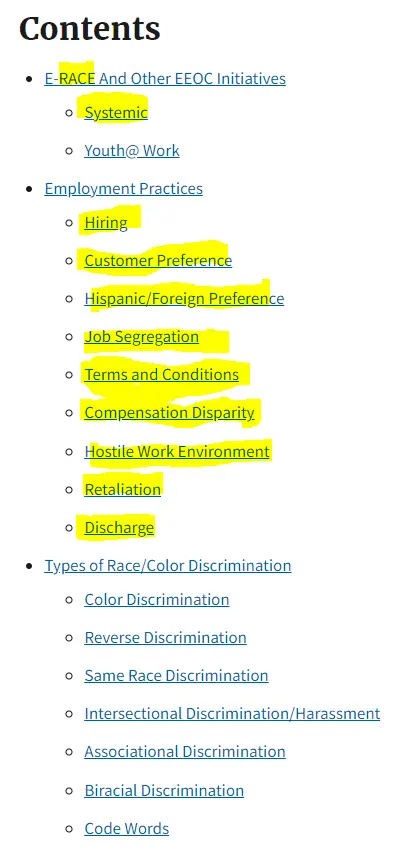 So you see all of those highlighted categories, those are the different race based ways employers discriminate against their workers. And actually you sending this back to me was very helpful to a current case because I have not read these in a while and you provided me with some usable case law, so I guess I should thank you, but I won't because you were not trying to help me