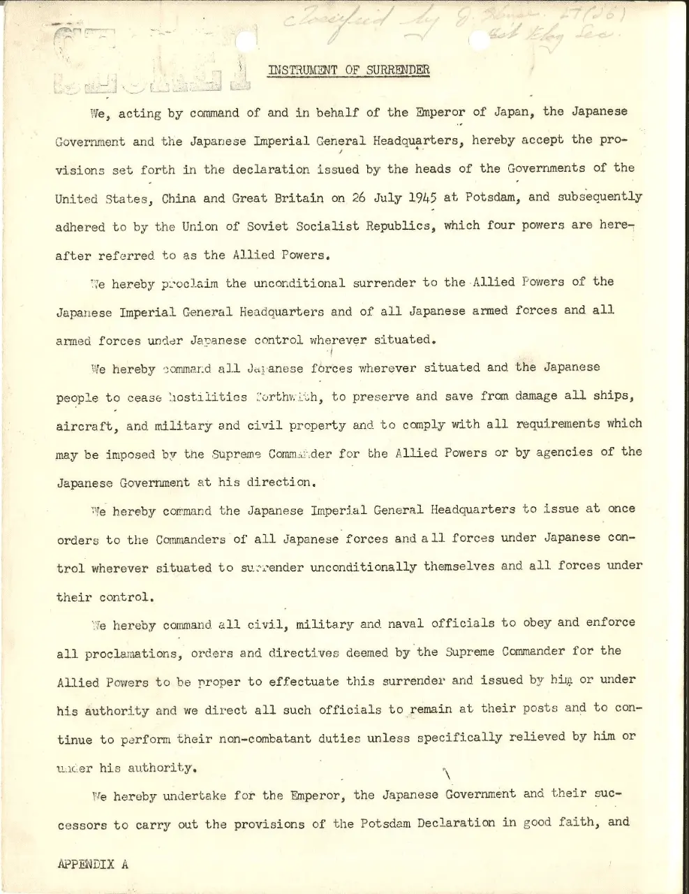 It was meant to be unconditional surrender at first. But at the first meeting between MacArthur and Hirohito in 1945, MacArthur decided to make use of Hirohito as a symbolic emperor without indicting him as a war criminal despite the fact that Truman and the American public wanted a severe punishment. Along with his advisor