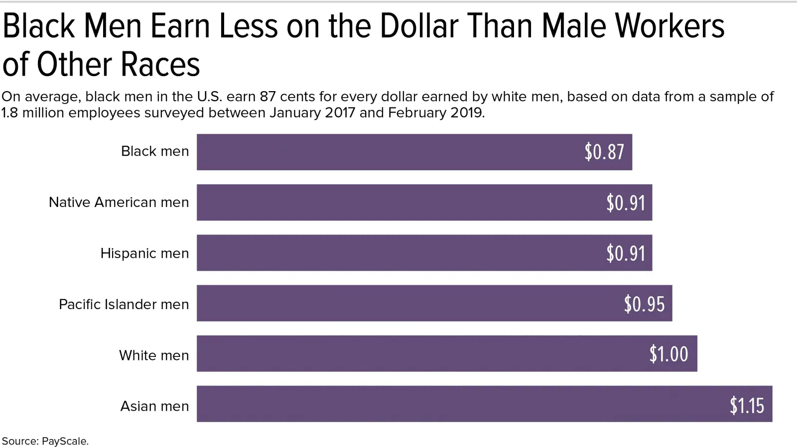 On average, black men earned 87 cents for every dollar a white man earned. Hispanic workers had the next largest gap, earning 91 cents for every dollar earned by white men.