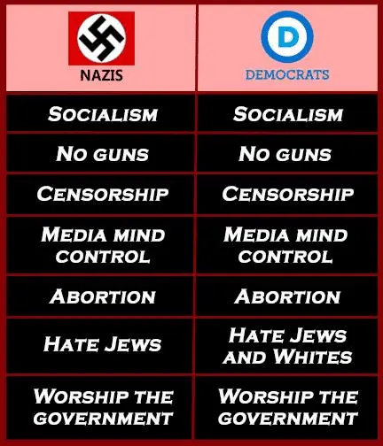 Except the Nazis were NOT Socialists. And I'm sure I could make a comparison between the Nazis and the GOP, starting with extreme nationalism and hatred of democracy.Your list is nonsense, what is not just plain lies are your biases coming out. And the equivalent list for the GOP is just as damning.No different than left-wingers obsessing about trump constantly.