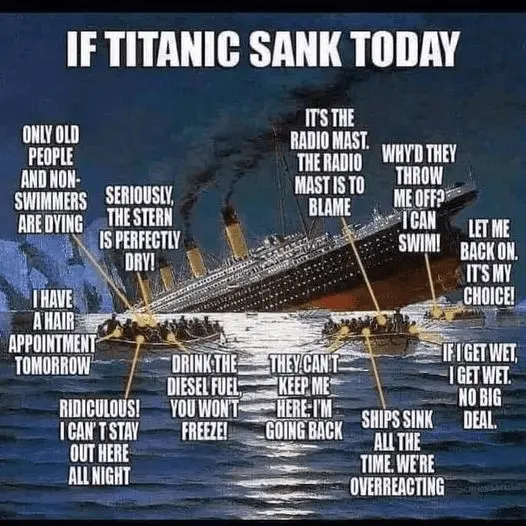 If the Titanic went down tonight, this would be the likely MAGA response. It is always in the absurd.
