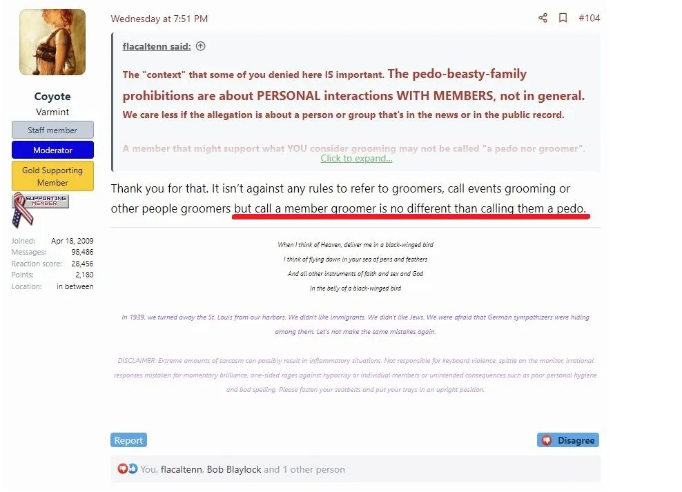 That's your BAR for winning an exemption to use those nuclear flamey words against them. They MUST OPENLY STATE SUPPORT in their content for characters like the one in your link. If you see that -- go to moderation before you pull the pin on the groomer grenade -- OK?
