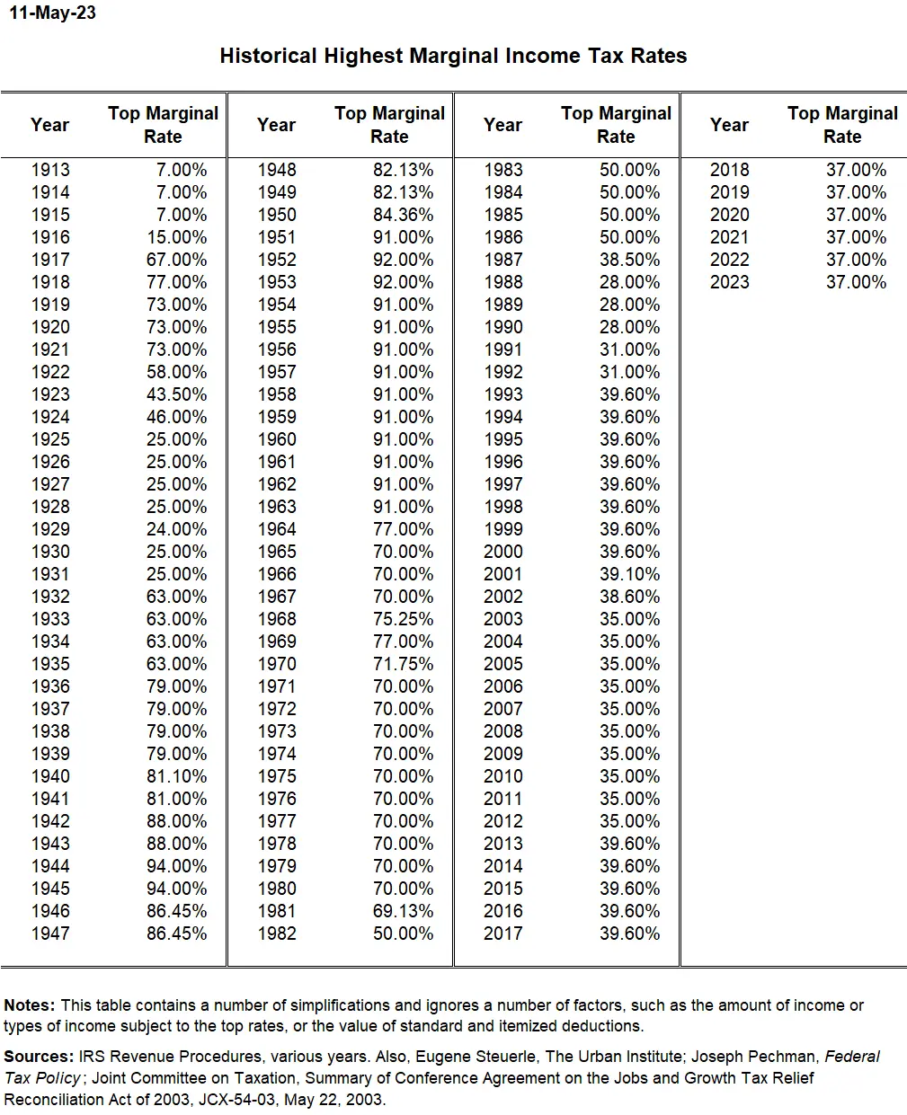 And here are the actual rates for top earners. Keep in mind that many didn't pay those rates due to exemptions, exclusions, loopholes, deductions, etc. Also, I believe many would argue that the economy and wealth grew very well during the 80's too.