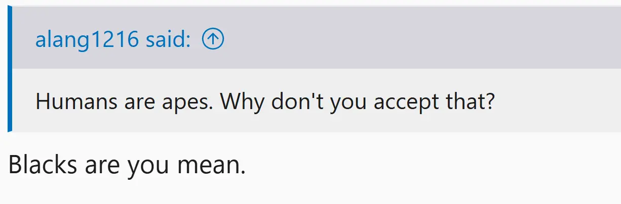 Nothing said was racist. Factually it was a question. When a person spoke of evolving apes. And blacks you well know are claimed to originate in Africa. According to the other what was it if not apes?