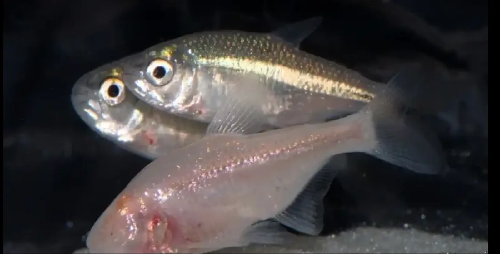 I'm guessing the fish with eyes did not live in the same cave (or any cave probably) with the blind one. I suspect the photographer took fish from two different environments and brought them together for a photo op to contrast them or as a hoax on the easily fooled.Here is a photo of blind Tetras with two having eyes.