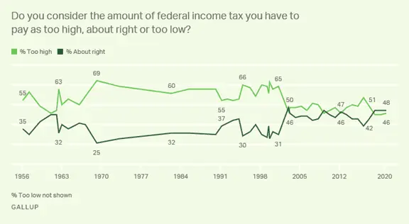 3) 94% of Americans think that their personal taxes are too high or about right, but not too low.