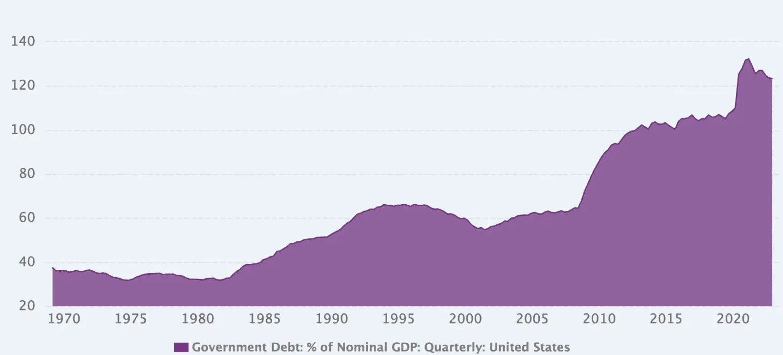 US Government debt accounted for 124.0 % of the country's Nominal GDP in Dec 2024, compared with the ratio of 123.1 % in the previous quarter.