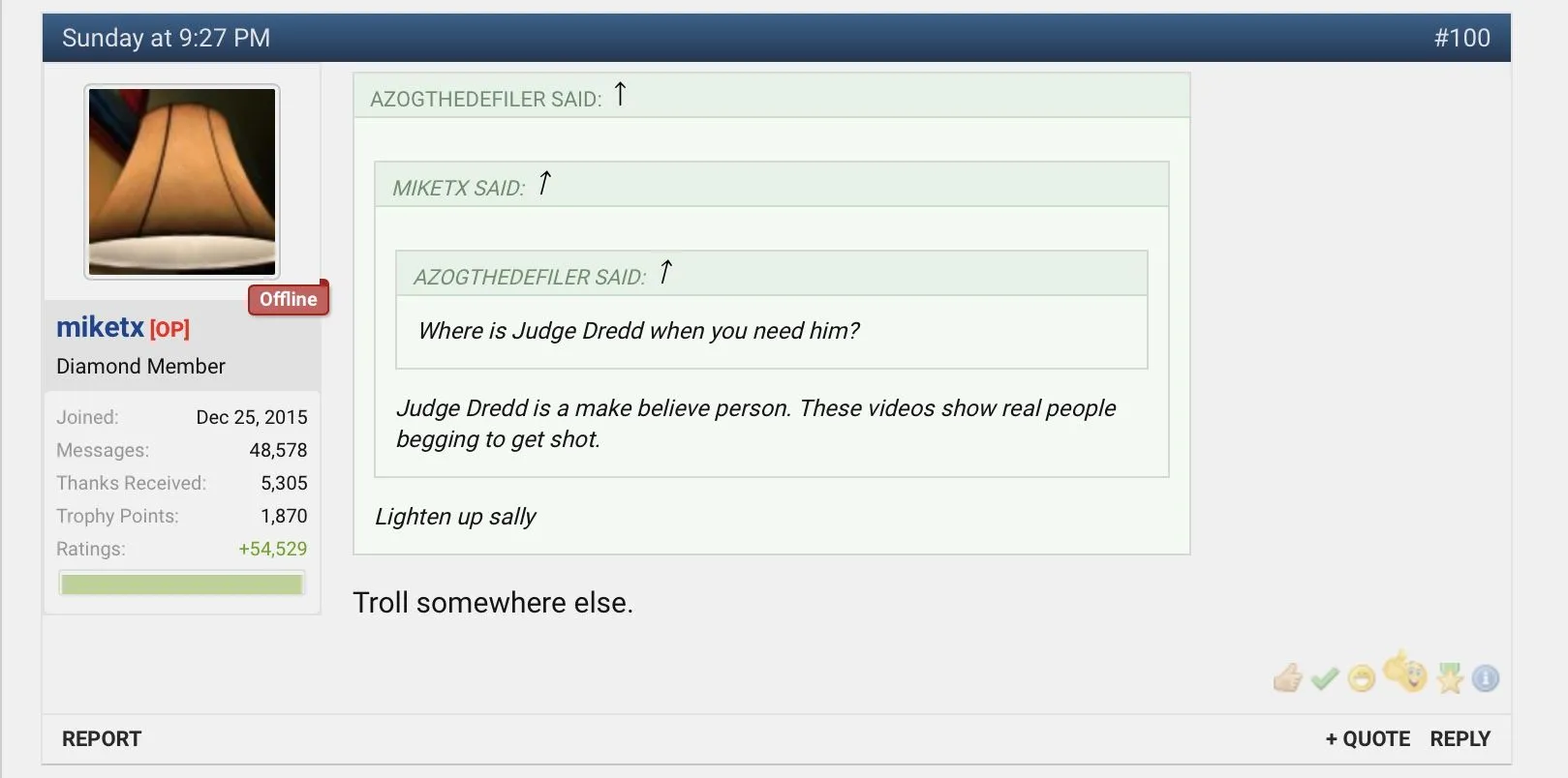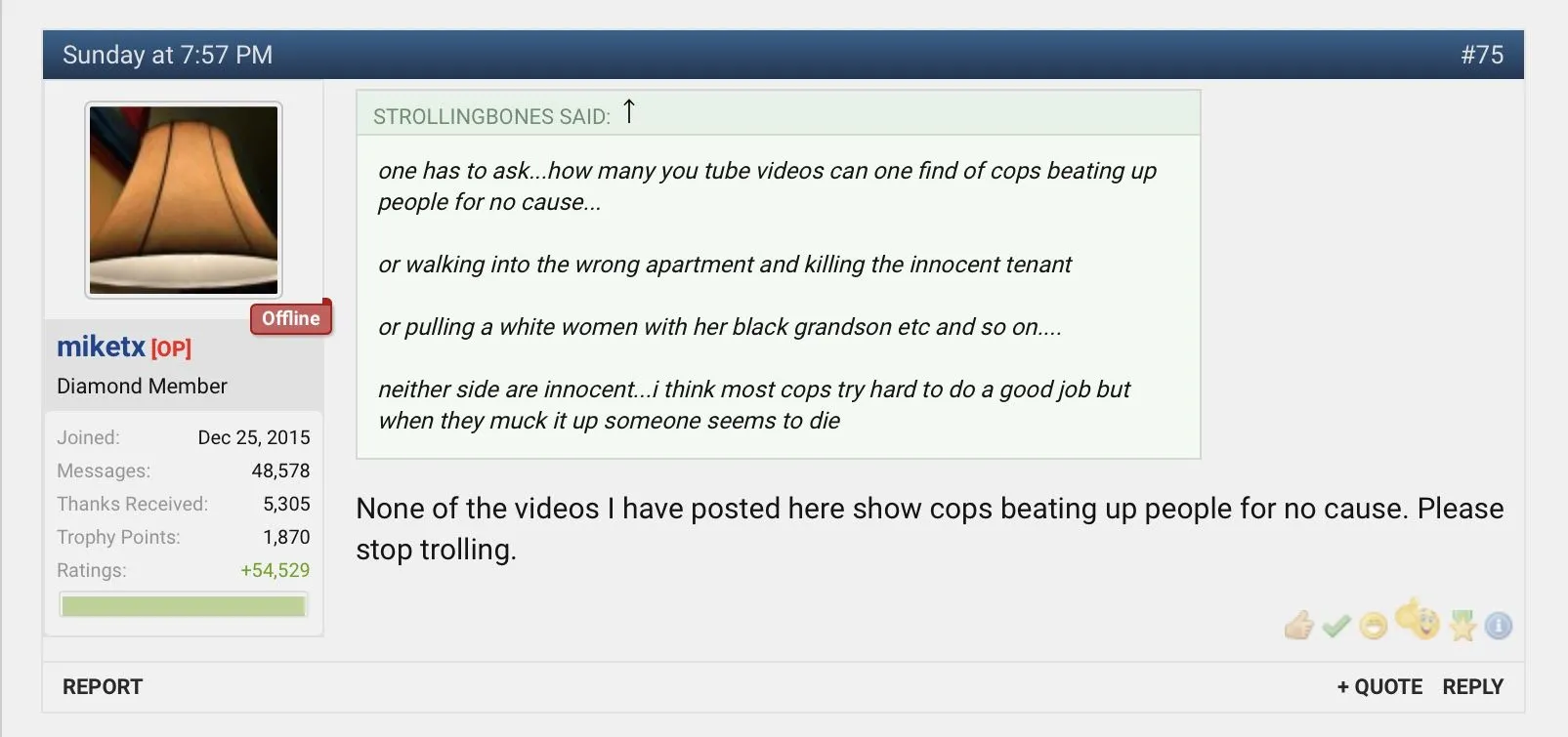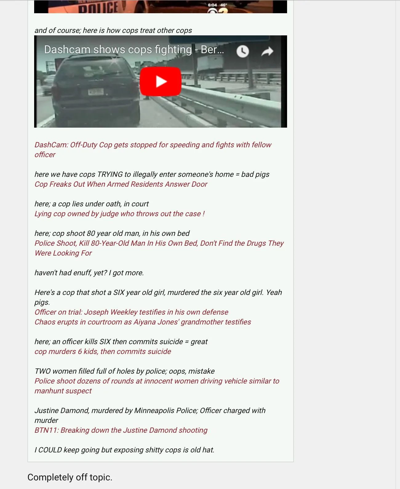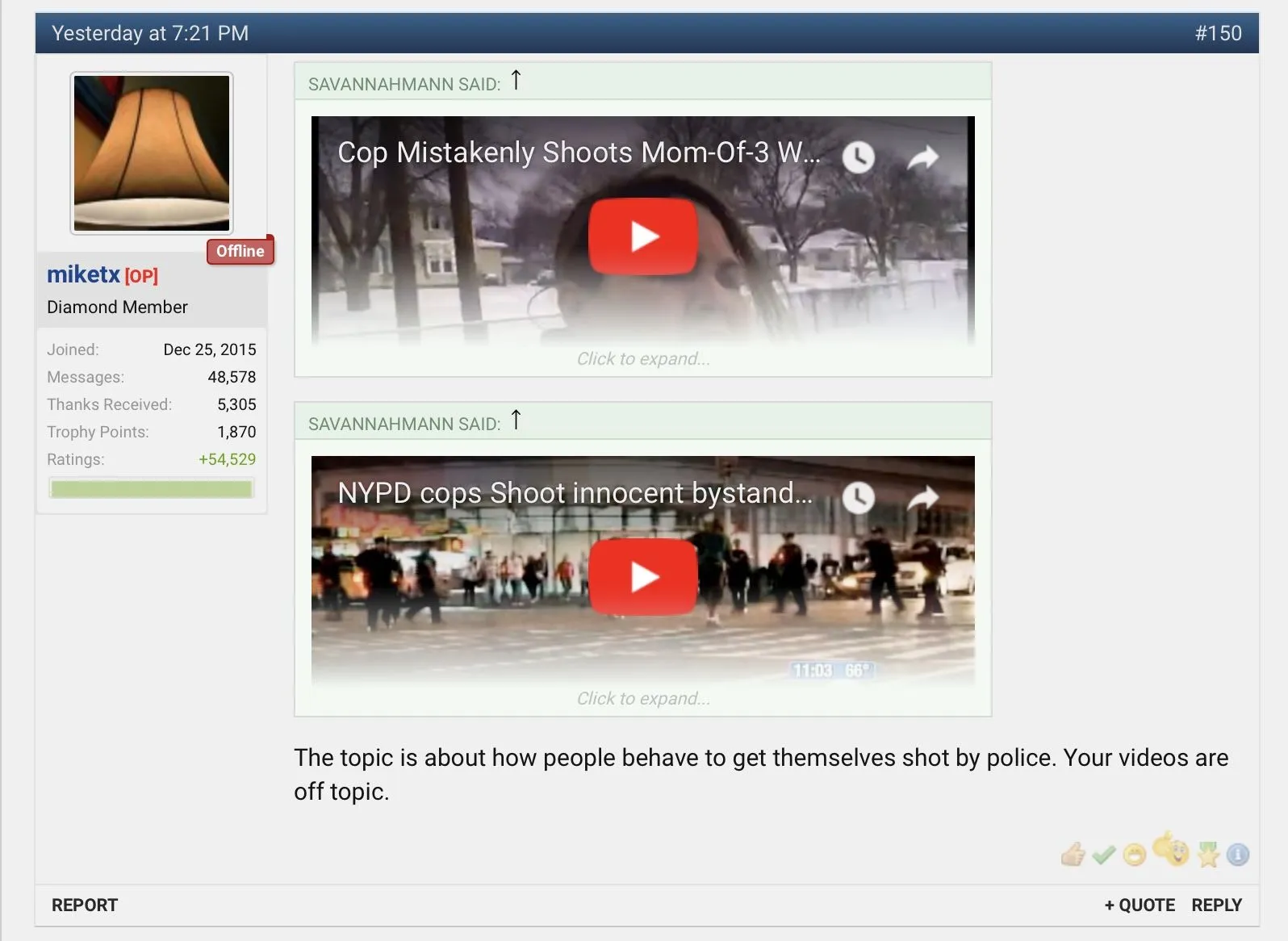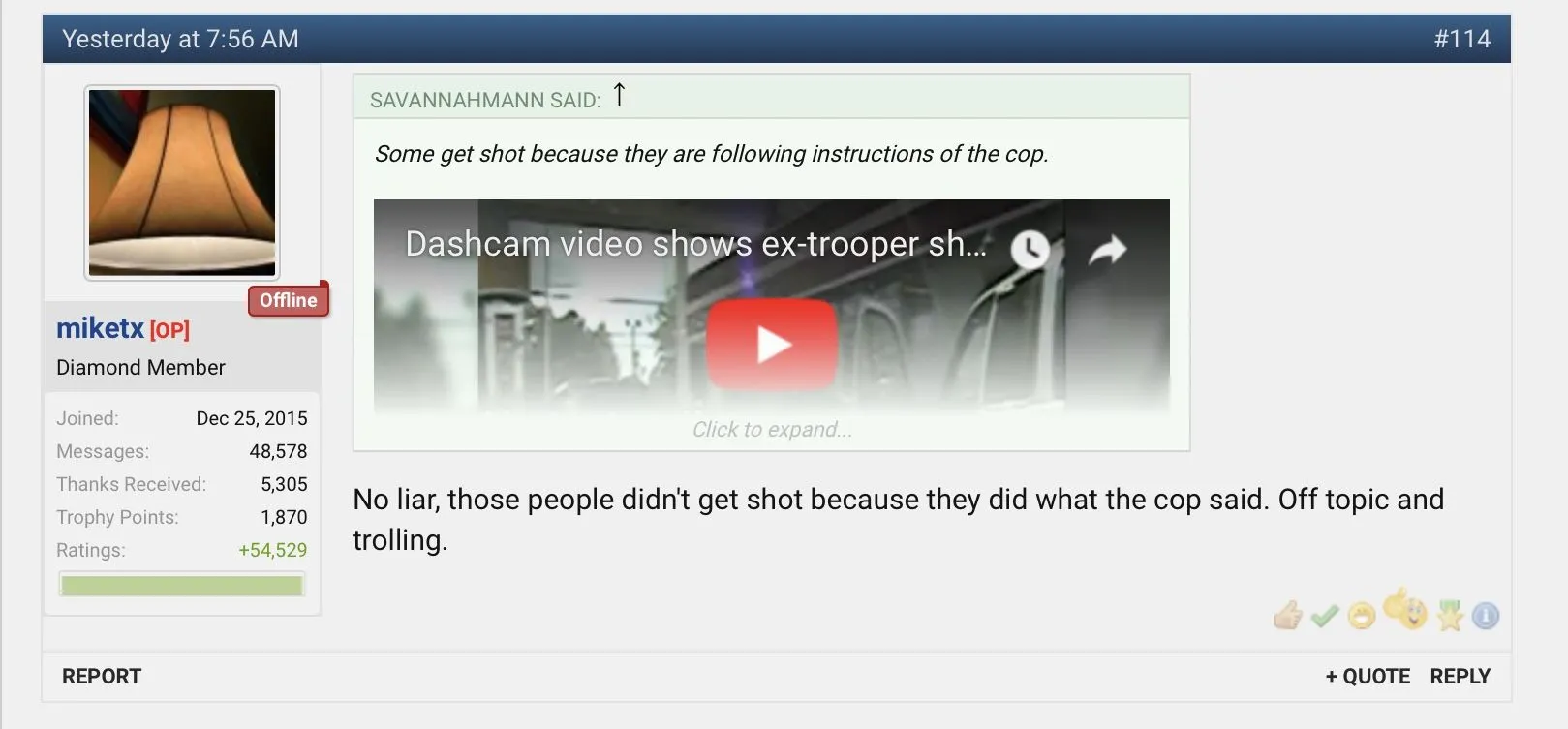The truth that the thread OP tried desperately to ignore was that anything you do, can get you shot. The first ones I posted showed the victims literally obeying the cop instantly. Cop shouts show me your hands, and the guy throws them into the air rapidly, and is shot. Give me your drivers license, the guy reaches into the truck for it, in compliance with the instruction, and then is shouted at to get out of the truck, again complies instantly, and is shot while raising his hands.