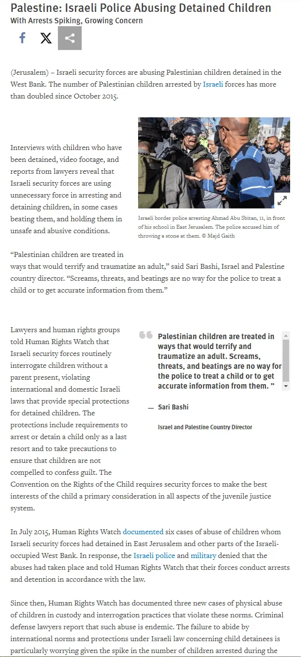 Nonsense, children under 14 are turned over to the PA and everyone held in administrative detention has a lawyer and has a hearing every two weeks in which the state must prove to the court that it is necessary for security reasons to hold him longer. Cases involving abuse of the system can be taken up by the High Court of Justice if they have substance.If it were Jewish children being "arrested" (kidnapped) and held without charge and denied visits from parents and legal counsel I think we'd all be appalled as we were in the 1940s. But the extremist Zionists (Jewish nationalists) manage to get away with doing the very same cruelty to non-Jew children and in fact even get supported for it by the West both Democrats and Republicans, even the Germans are scared of Israel and what speak out against this.