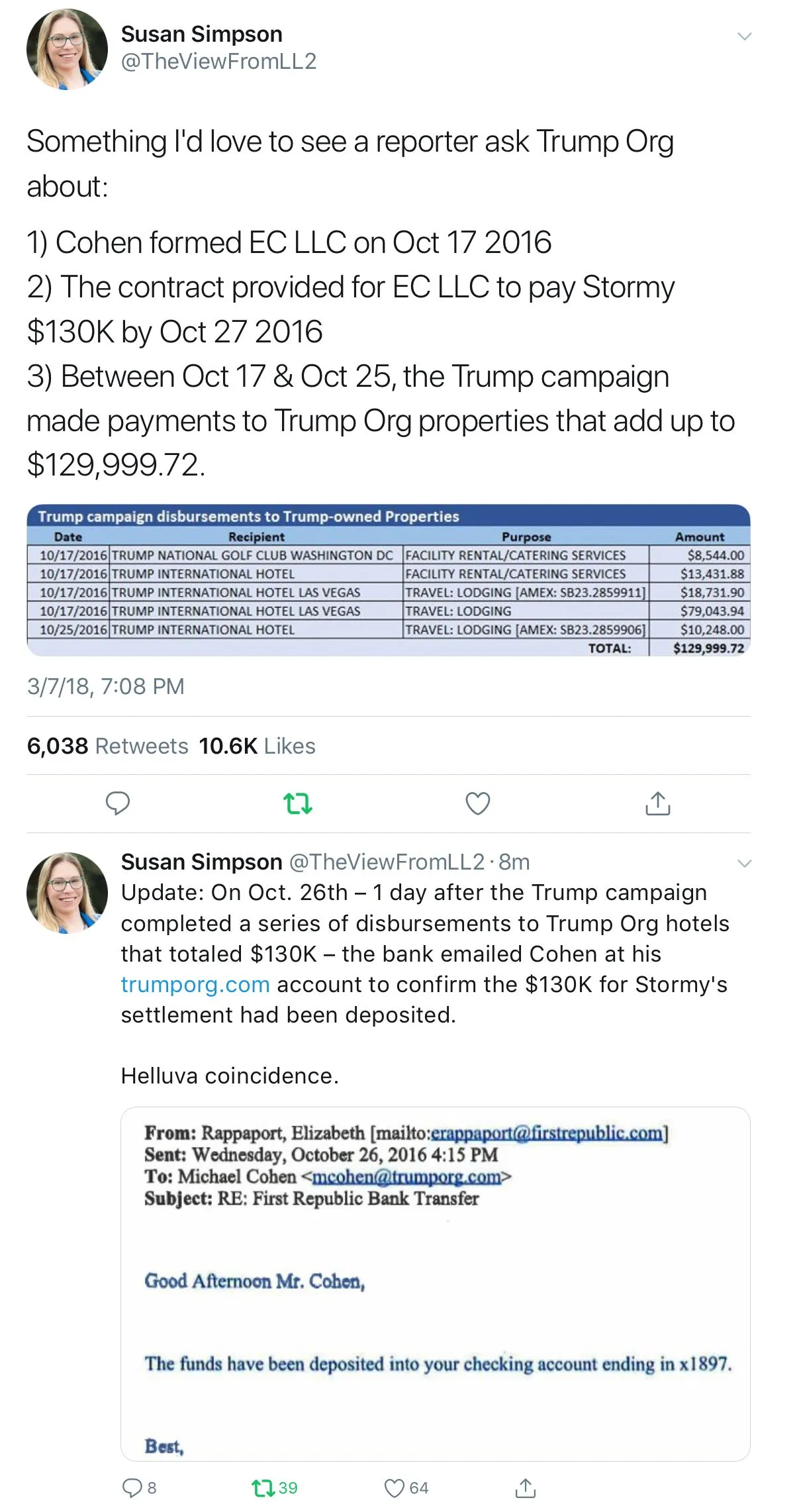 This entire mess was probably started by Mueller's investigators subpoena of the bank's records on Cohen's check to Daniels....