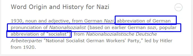 My citation explained that the word "Nazi" from the phonetic spelling of the first two syllables of 'Nationalsozialist'. The reference to the socialists who were the enemies of the Nazis was to explain that the first two syllables of 'sozialist' was to compare how the Sozis were distinguished from the Nazis in common parlance in pre-war Germany.This is the definition Eloy is using from his own link he deliberately ignores scrolling down because he wants people incorrectly to think that the Socialist part has NOTHING to do with Nazi.Your post is funny. You even used the German 'Nationalsozialistische' but when speaking German, the beginning of the word sounds like 'Nazi'. The next part of the compound is 'sozialistische' but it makes no linguistic sense to take the 'zi' from its middle rather than the 'so' from the beginning. The German abbreviation obviously a phonetic spelling of the first two syllables compound word. I hopes this helps.You are wrong.Hitler was a Nationalist. The word itself gave us the word 'Nazi'.Nationalism is being proud of one's country and its ideals and wanting to support the interests of their country and its citizens. What's wrong with being a nationalist?