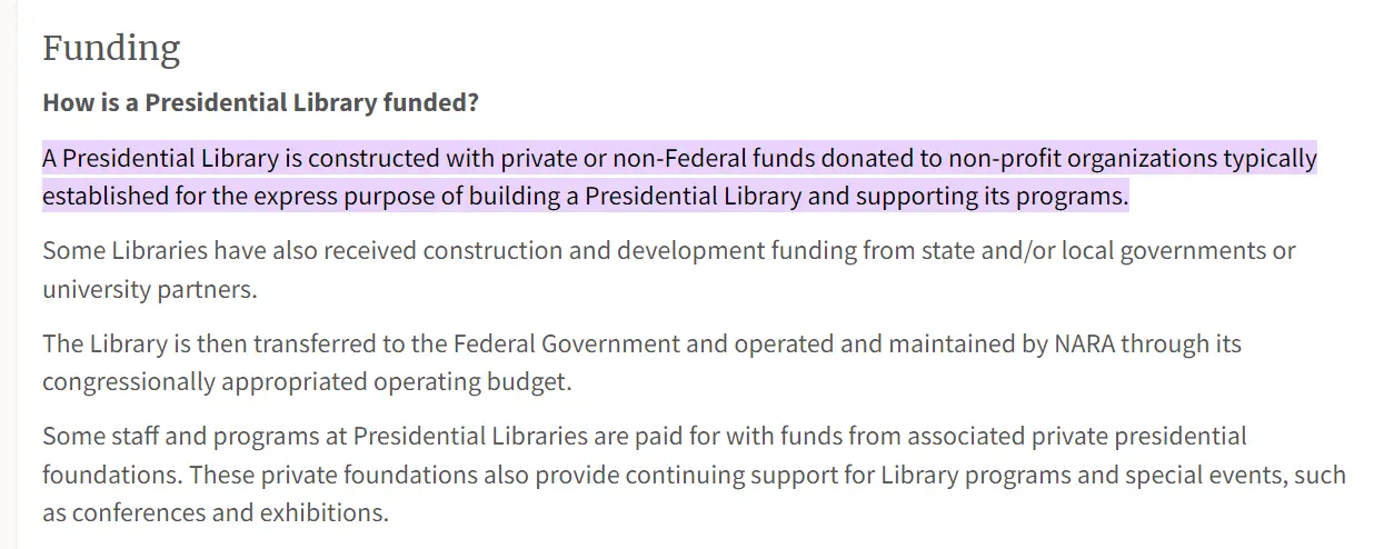 If the President establishes a non-profit "Presidential Library", the non-profit manages the facilities. However the NARA ** STILL ** retains ownership and responsibility for the documents and will coordinate with the non-profit for public access and displays. Basically the organization manages the building, the NARA manages the Presidential Records.