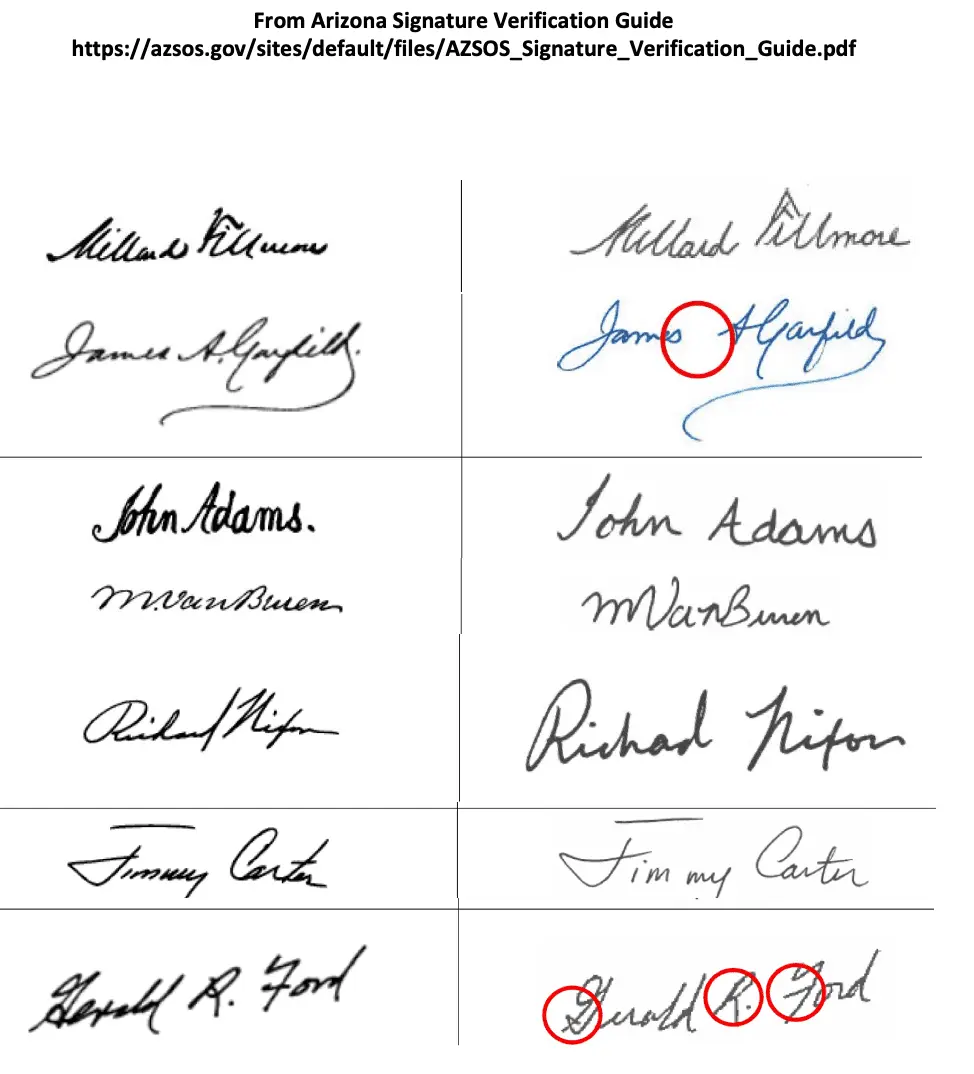 Attached are "genuine" and "questioned signatures" EXAMPLES... Remember EXAMPLES... in Arizona as there is a serous question regarding the validity of signatures. Remember the voter registered signature is then compared to the ballot envelope's voter signature and this is the point...