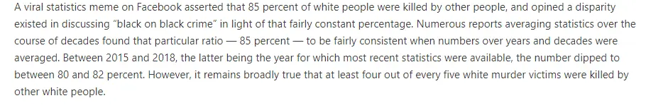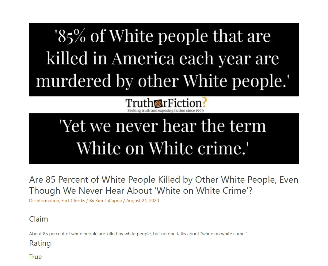 Are 85 Percent of White People Killed by Other White People, Even Though We Never Hear About 'White on White Crime'? - Truth or Fiction?