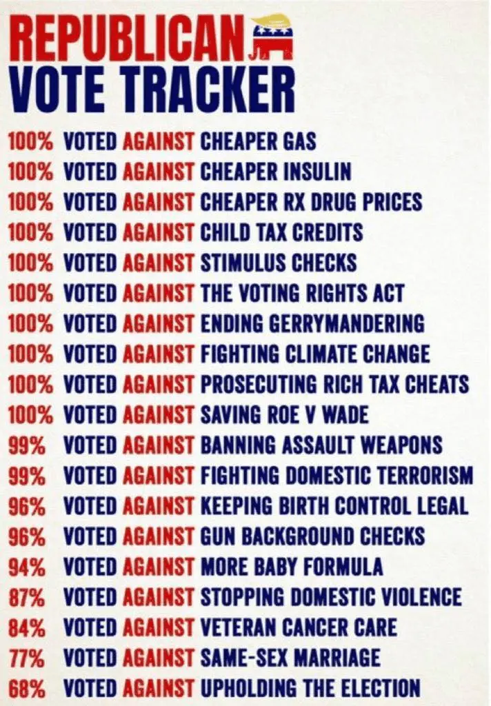 Democrats are being told that Republicans are going to take away SSI, take over their bodies, take away baby formula, remove child tax credits, make gas more expensive, etc, etc. All lies but, that's all they have. Just look at the tripe posted by Lush.Disclaimer: I know a LOT of Democrats and for the most part they are just ordinary Americans who want the same things all Americans want: a decent roof over their heads, food to eat, clothes to wear, enough money to give their children good things, afford a few other necessary/satisfying/interesting/fun things and/or help others.