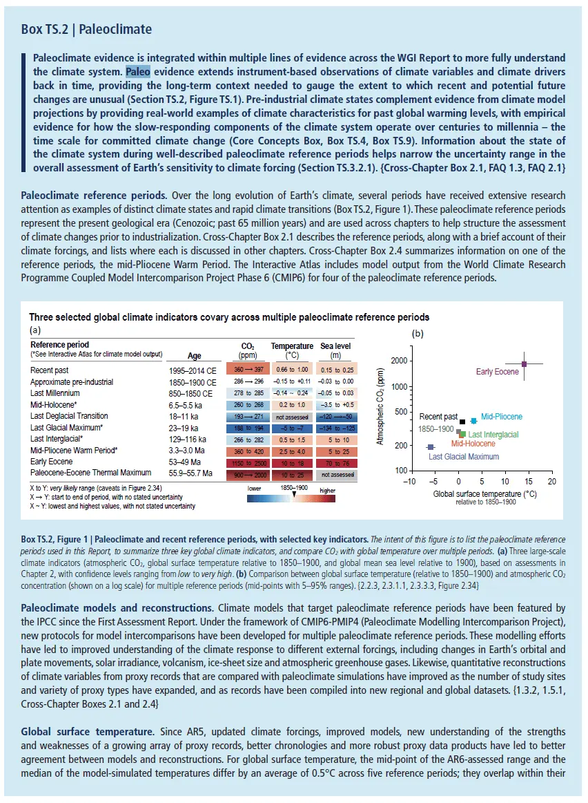 Equilibrium climate sensitivity. Paleoclimate data provide evidence to estimate equilibrium climate sensitivity (ECS15) (Section TS.3.2.1). In AR6, refinements in paleo data for paleoclimate reference periods indicate that ECS is very likely greater than 1.5°C and likely less than 4.5°C, which is largely consistent with other lines of evidence and helps narrow the uncertainty range of the overall assessment of ECS. Some of the CMIP6 climate models that have either high (>5°C) or low (<2°C) ECS also simulate past global surface temperature changes outside the range of proxy-based reconstructions for the coldest and warmest reference periods. Since AR5, independent lines of evidence, including proxy records from past warm periods and glacial–interglacial cycles, indicate that sensitivity to forcing increases as temperature increases (Section TS.3.2.2). {7.4.3.2, 7.5.3, 7.5.6, Table 7.11}
