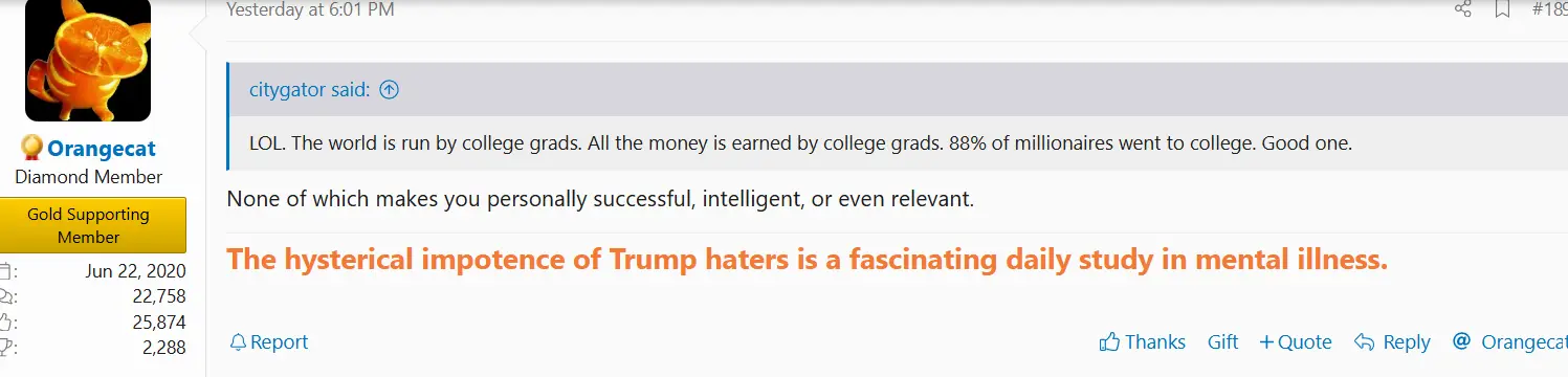 You dipshit. The conversation went downhill when, instead of debating the fact that almost all successful people are college educated, you decided to attack me personally and I point that out and you have YET to recover, Karen.As if your triggered responses are the pinnacle of enlightened debate, Karen.![]()