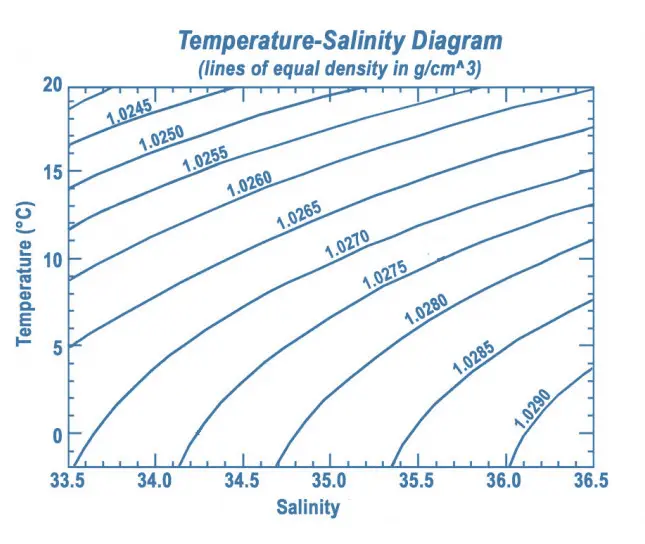"Although maximum densities occur at temperatures of around 4°C for fresh waters, for Absolute Salinities greater than 23.8 g/kg, seawaters at the freezing point are most dense. Freezing temperature also decreases with salinity, with typical seawater freezing at around -1.9°C at atmospheric pressure."