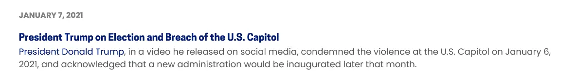 President Donald Trump, in a video he released on social media, condemned the violence at the U.S. Capitol on January 6, 2021, and acknowledged that a new administration would be inaugurated later that month.www.c-span.org