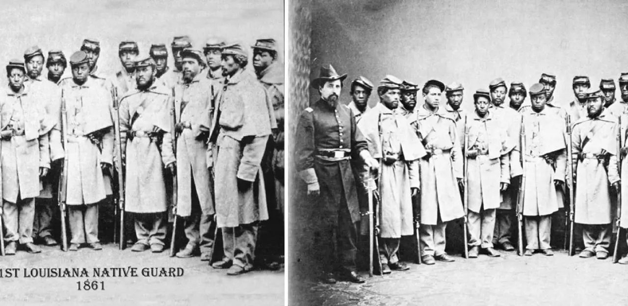 The altered photograph at left is considered by many to be evidence of black Confederate soldiers. However, the photograph has been intentionally cropped and mislabeled. The photograph is presented in its original state at right, in which a Union officer is clearly shown. 1,500 free blacks formed the "1st Louisiana Native Guards" in the early days of the war, but they were ordered to disband by the Confederacy in January 1862. Some of the men of the unit later joined the Union Army. This photograph is of a Union U.S.C.T unit. The University of Virginia