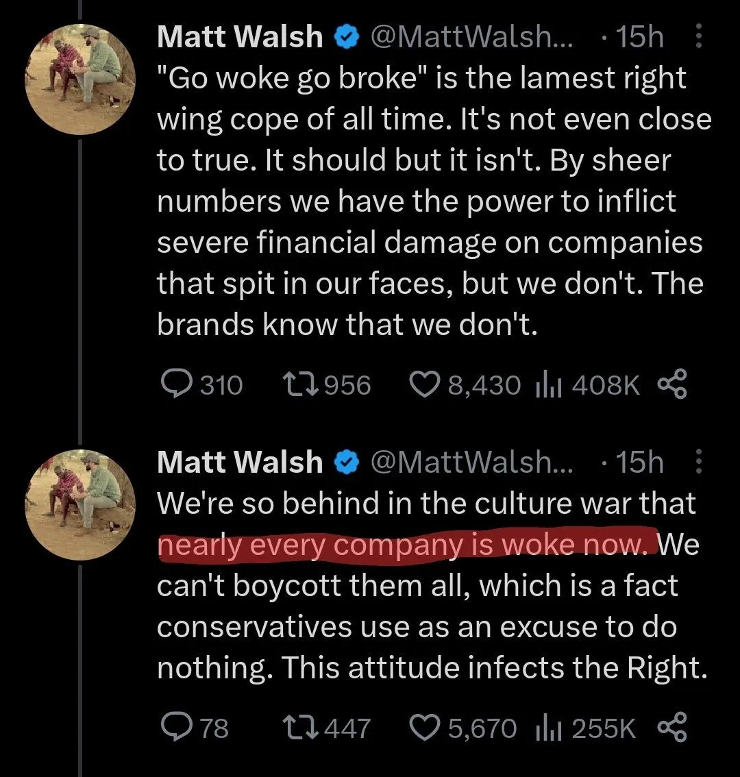 Problem is........since both parties (but especially Republicans) have looked the other way while handful of corporations have been able to buy up huge percentages of the market; culture war based boycotts like these are indeed laughed at -- because of how futile they are......but Conservative Super-Patriot Matt Walsh brings up a brilliant point......Just focus on one smaller company and try to make an example out of them...