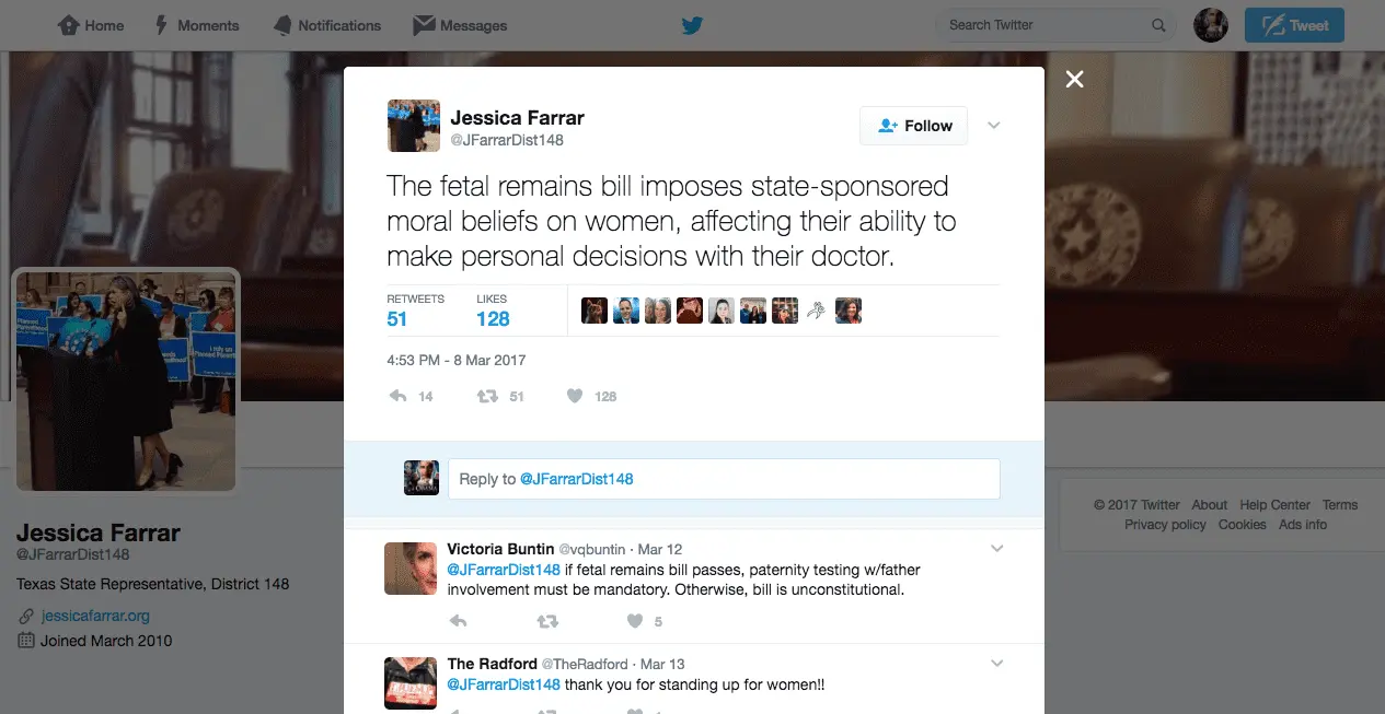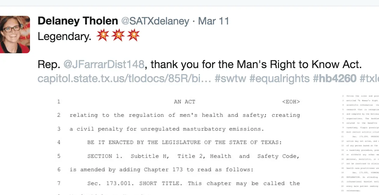 .....Farrar said her bill, titled the “Man’s Right To Know Act,” takes the argument that “we’re looking at the sanctity of life,” a term that has already been highly debated this legislative session as several Texas Republicans have proposed legislation aimed at abortions.