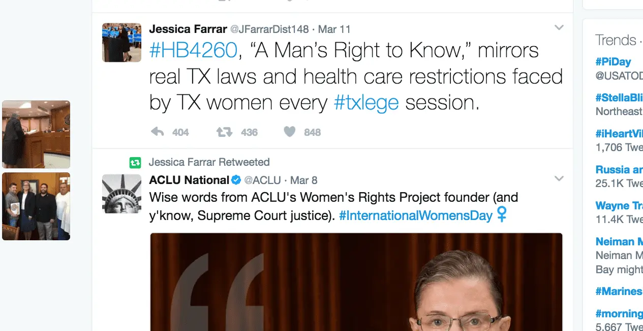 Jessica Farrar says that men should have to undergo the same “unnecessary” and “invasive” procedures that she says Texas women are subjected to under recently passed state laws.