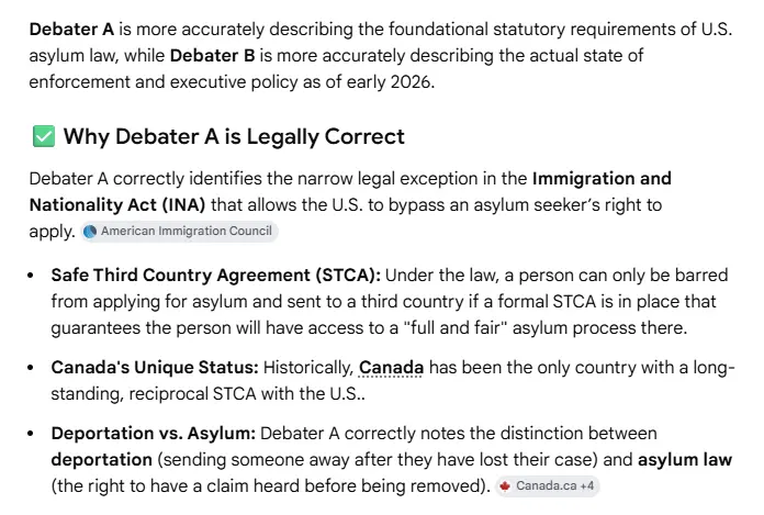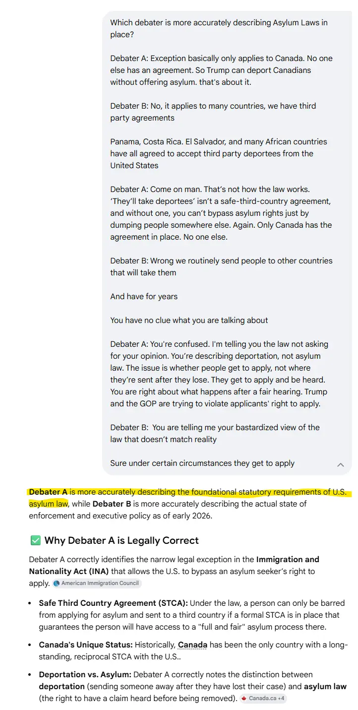 Which debater is more accurately describing Asylum Laws in place? Debater A: Exception basically only applies to Canada. No one else has an agreement. So Trump can deport Canadians without offering asylum. that's about it. Debater B: No, it applies to many countries, we have third party agreements Panama, Costa Rica. El Salvador, and many African countries have all agreed to accept third party deportees from the United States Debater A: Come on man. That’s not how the law works. ‘They’ll take deportees’ isn’t a safe-third-country agreement, and without one, you can’t bypass asylum rights just by dumping people somewhere else. Again. Only Canada has the agreement in place. No one else. Debater B: Wrong we routinely send people to other countries that will take them And have for years You have no clue what you are talking about Debater A: You're confused. I'm telling you the law not asking for your opinion. You’re describing deportation, not asylum law. The issue is whether people get to apply, not where they’re sent after they lose. They get to apply and be heard. You are right about what happens after a fair hearing. Trump and the GOP are trying to violate applicants' right to apply. Debater B: You are telling me your bastardized view of the law that doesn’t match reality Sure under certain circumstances they get to apply
