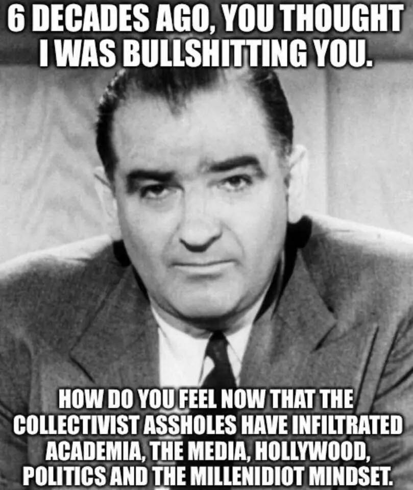 Except that McCarty was right.McCarthy was just one man. A singular demagogue. Right cause wrong man, We have a multitude of Jesse Smollett's and Patrice Collors's and their race baiting doing the same thing McCarthy did, baiting and using a cause to get money or votes? We are repeating history.