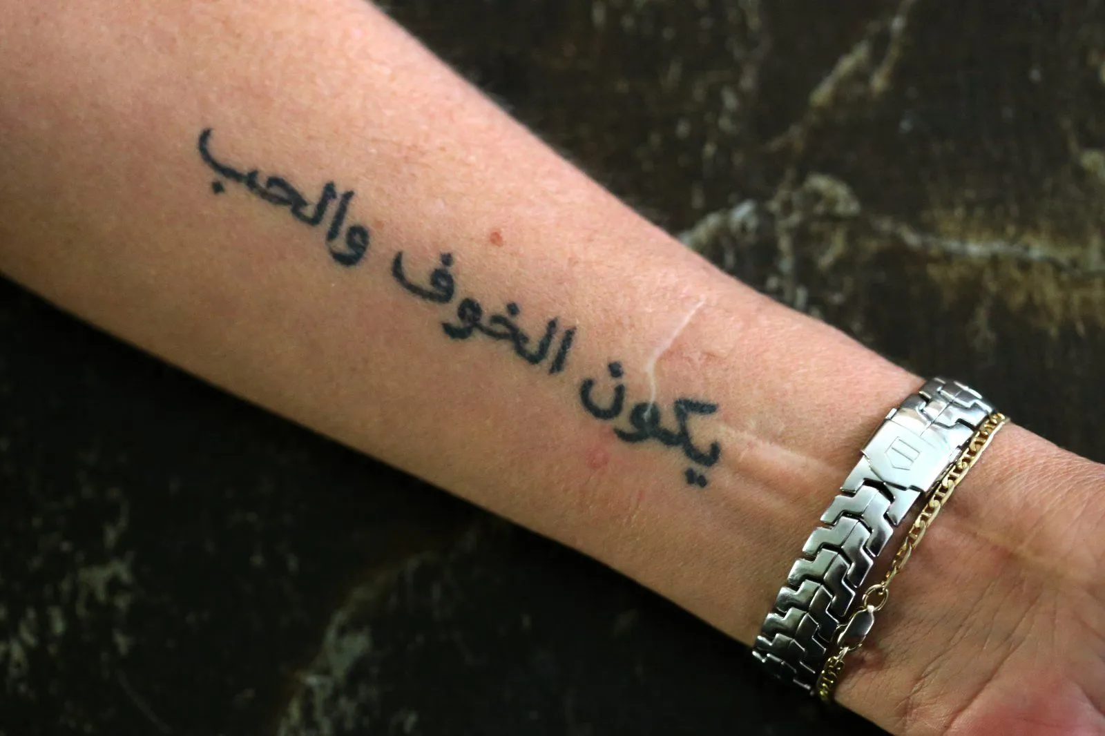 Sometimes tattoos can be strong reminders. This one's written in Arabic, but it loosely translates to "Be fearless in love". It's tattooed over the scar she got when she tried to kill herself: