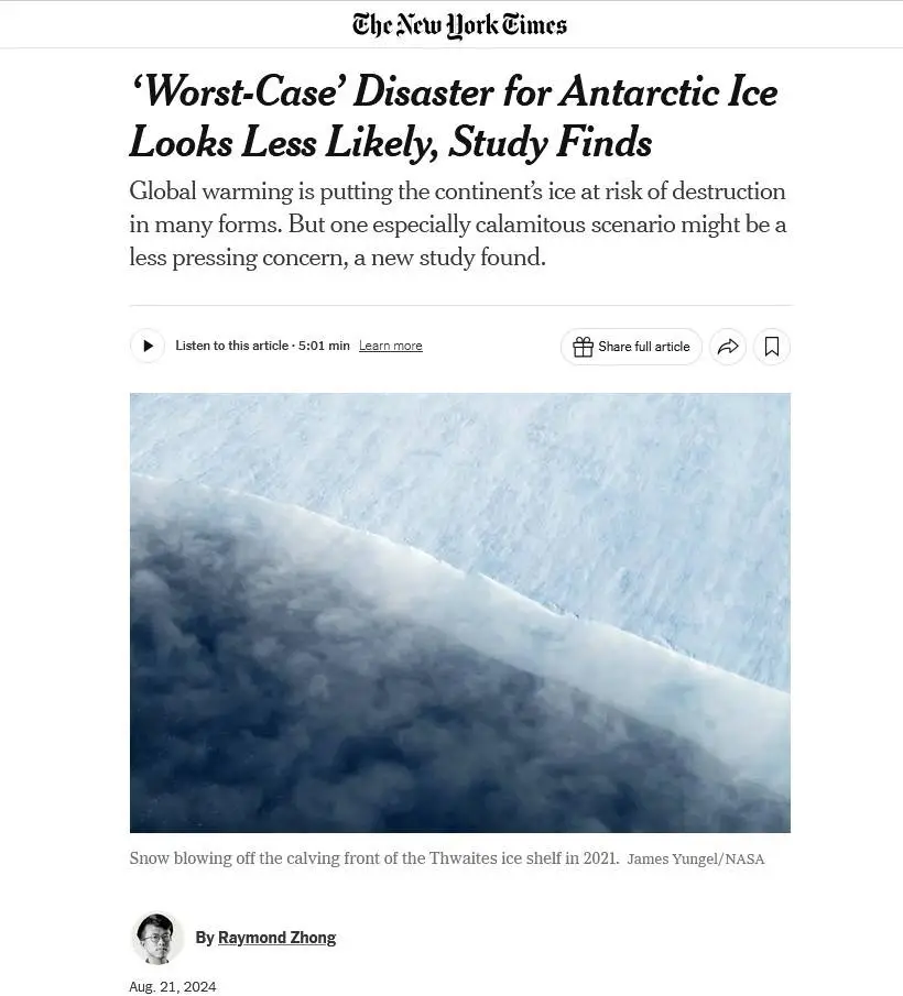 Global warming is putting the continent’s ice at risk of destruction in many forms. But one especially calamitous scenario might be a less pressing concern, a new study found.snippets: