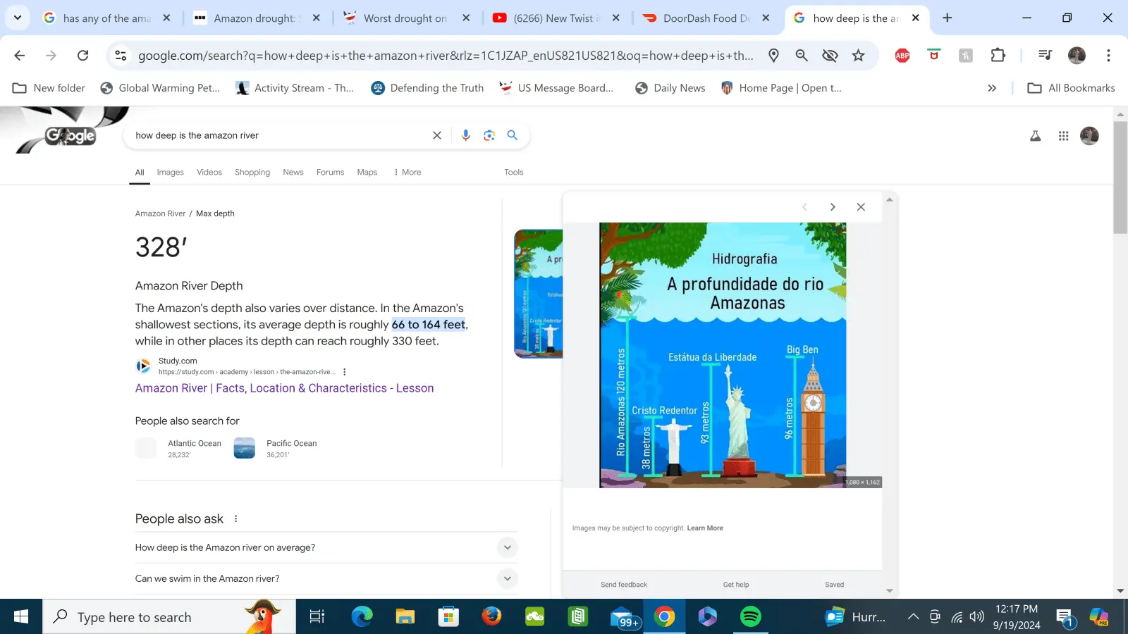 The width and depth of the Amazon River vary by season. In the dry season, the average width of the Amazon is between two and six miles. When the river floods in the wet season, the widest parts can reach 30 miles in width. The depth varies from 66 to 164 feet.