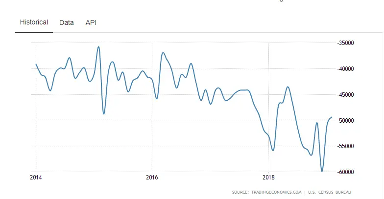 The US trade deficit narrowed to USD 49.4 billion in February 2019, the smallest since June 2018, from USD 51.1 billion in the previous month and compared to market expectations of USD 53.5 billion. Exports surged 1.1 percent while imports rose at a softer 0.2 percent amid ongoing trade negotiations with China.