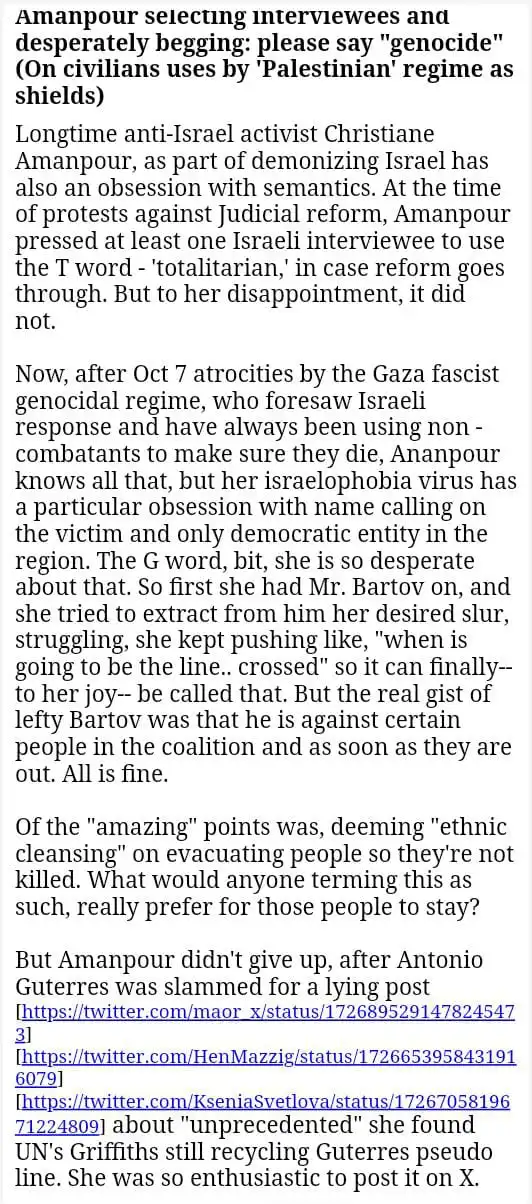 Amanpour selecting interviewees and desperately begging: please say "genocide" (On civilians uses by 'Palestinian' regime as shields)