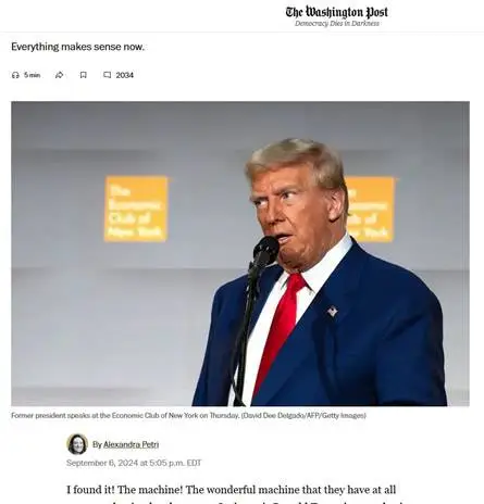 A similar process occurs in print. If it were not for the machine, we would have headlines every day like “Would-Be President Rambles Unintelligibly For Eighty Minutes After Promising He Would Speak About The Economy; At Intervals We Glimpsed Something In The Torrent Of Words That If Pulled Out And Dried Off Might Become A Policy Idea, So We Sent Several Guys In After It, But None Of Them Returned Alive, Except For One Guy Who Just Said ‘The Horror, The Horror’ After We Retrieved Him And He’s Now Staring Off Silently Into The Void. Is Donald Trump Entirely Well? Harris Also Delivered Remarks But Not As Many As We Wanted.” Maybe we should have those headlines, but, thanks to the machine, we don’t.