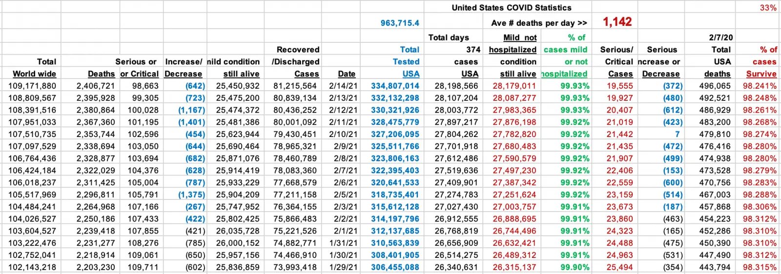 Case in point... since 2/7/20 I've tracked COVID from this web site:Coronavirus Update (Live): 109,254,439 Cases and 2,408,138 Deaths from COVID-19 Virus Pandemic - Worldometer