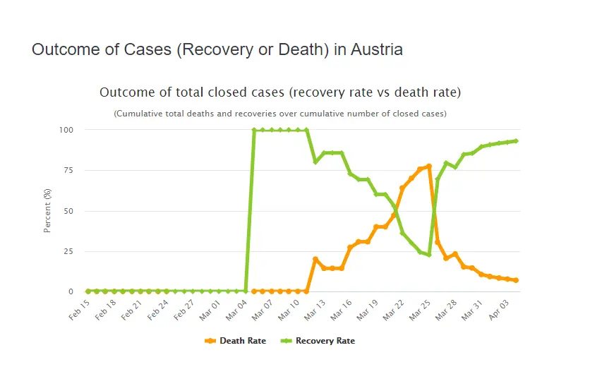 The below graph again show March 26 as the Peak, you then see the Death Rate going down and the Recovery Rate going up: