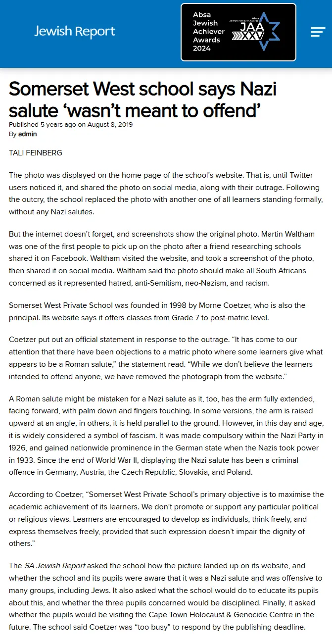 At first glance, the picture that appeared on Somerset West Private School’s website appeared innocent enough – matric pupils playing the fool in a relaxed school photograph. But a closer look shows three pupils doing a “Heil Hitler” Nazi salute as they stare straight ahead at the camera.www.sajr.co.za
