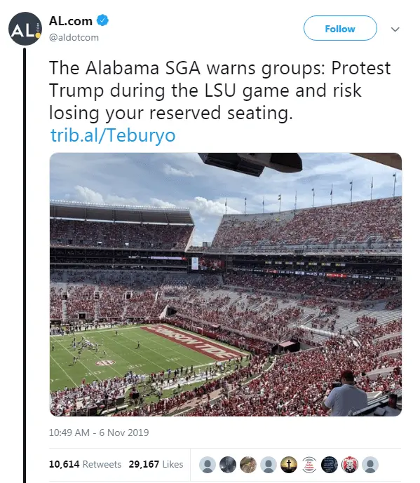 Alabama SGA to students: Protesting at LSU game may result in losing reserved seats