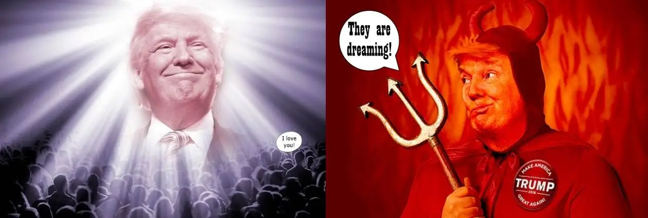 If Trumpers believe he is God, then that means that the opposite also is trueThat's a whole lot of hoop jumping to justify the contradiction. Trump isn't Satan, no matter how much you think he is, and you can't say your belief in God justifies your hating someone.