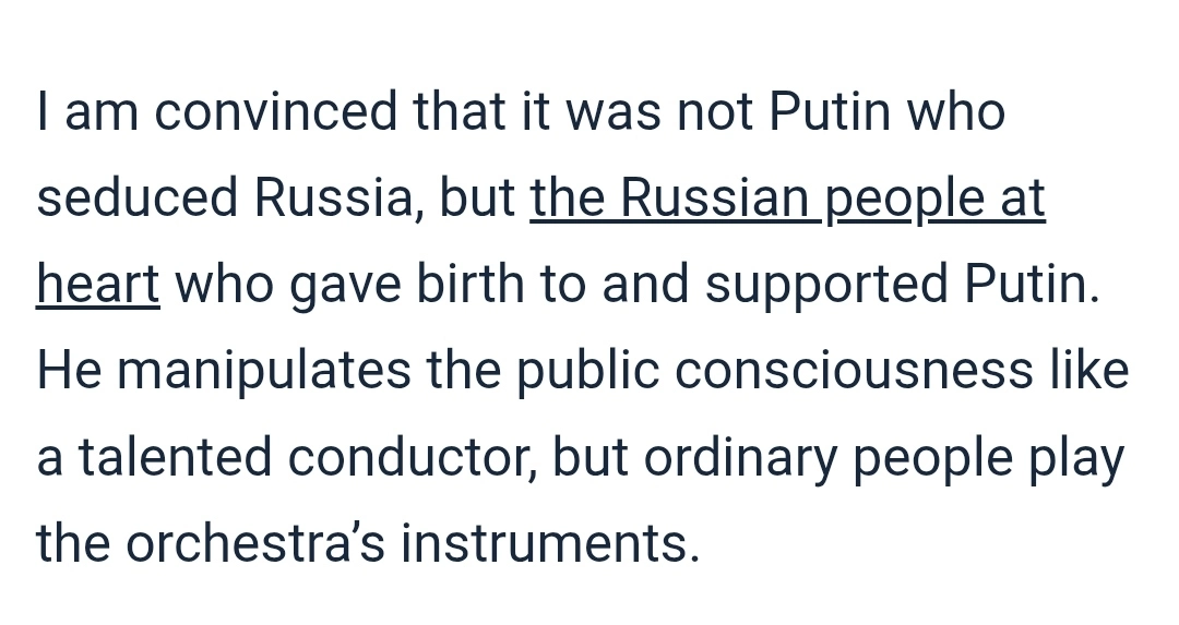 Wow. Looks like, Putin in your "Fake News World" is even less realistic than Sauron in "The Rings of Power" world. Some kind of supernatural creature, a demon in human form, who's dark magic directly control innumerable hordes of mindless zombies. May be, something like King of Night from "The Game of Thrones". Really stupid conception, and that's how they'd ruined the last season....Russians in our universe are victims of Putin, it started off with prosperity, but without adequate "checks and balances" he consolidated power and became a vicious dictator. That is why we always limit the power of US presidents.