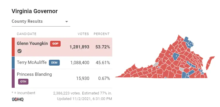 Fairfax and Prince William are two of the most populated and not fully counted.The Biden candidate progressive shill is 88,000 votes behind.