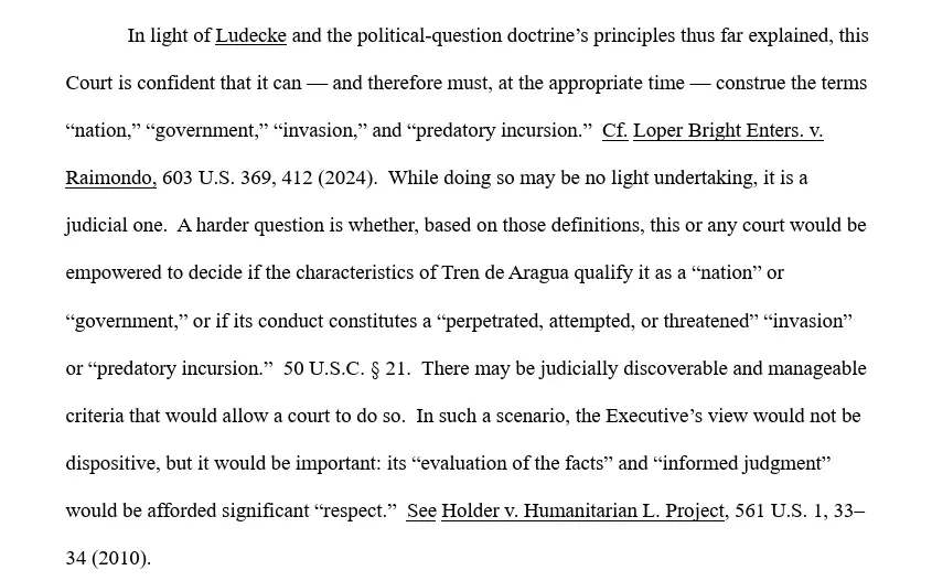The judge stated as fact that the train de Arafat members here that were released from Venezuela with instructions to come here was not a “predatory incursion. “ That would be difficult to say as an argument, and certainly is not a fact.