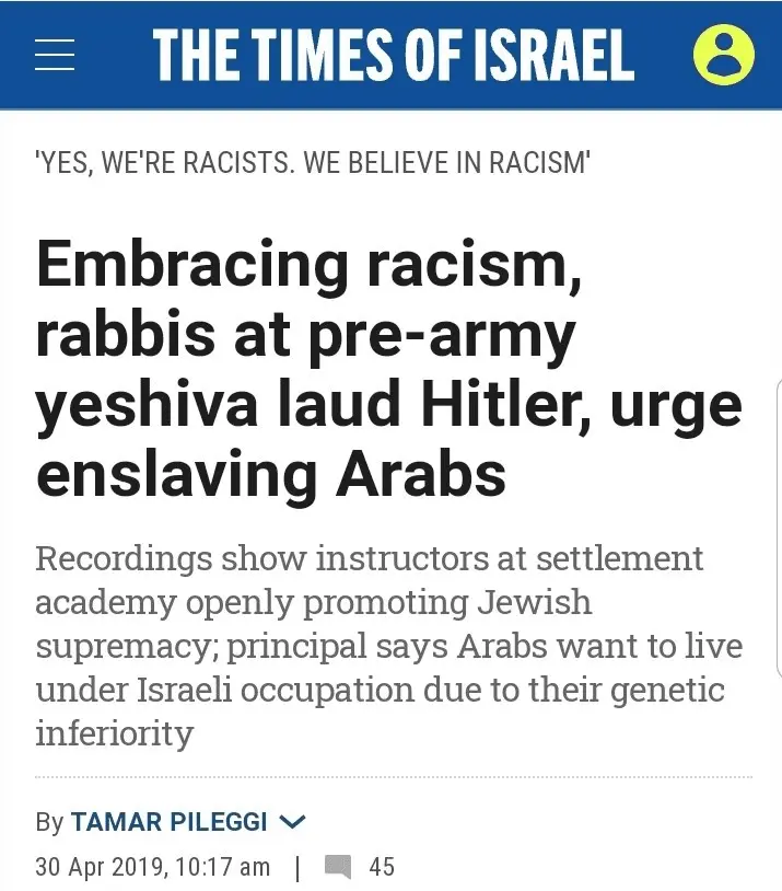 For some reason, stories of this type are not reported in the Western media. "In a series of undated recordings published by Channel 13 news on Monday, Rabbi Eliezer Kashtiel, the head of the Bnei David academy in Eli, can be heard calling for the enslavement of the “stupid and violent” non-Jews due to their genetic inferiority.“The gentiles will want to be our slaves. Being a slave to a Jew is the best. They’re glad to be slaves, they want to be slaves,” he told a class in one of the video clips.