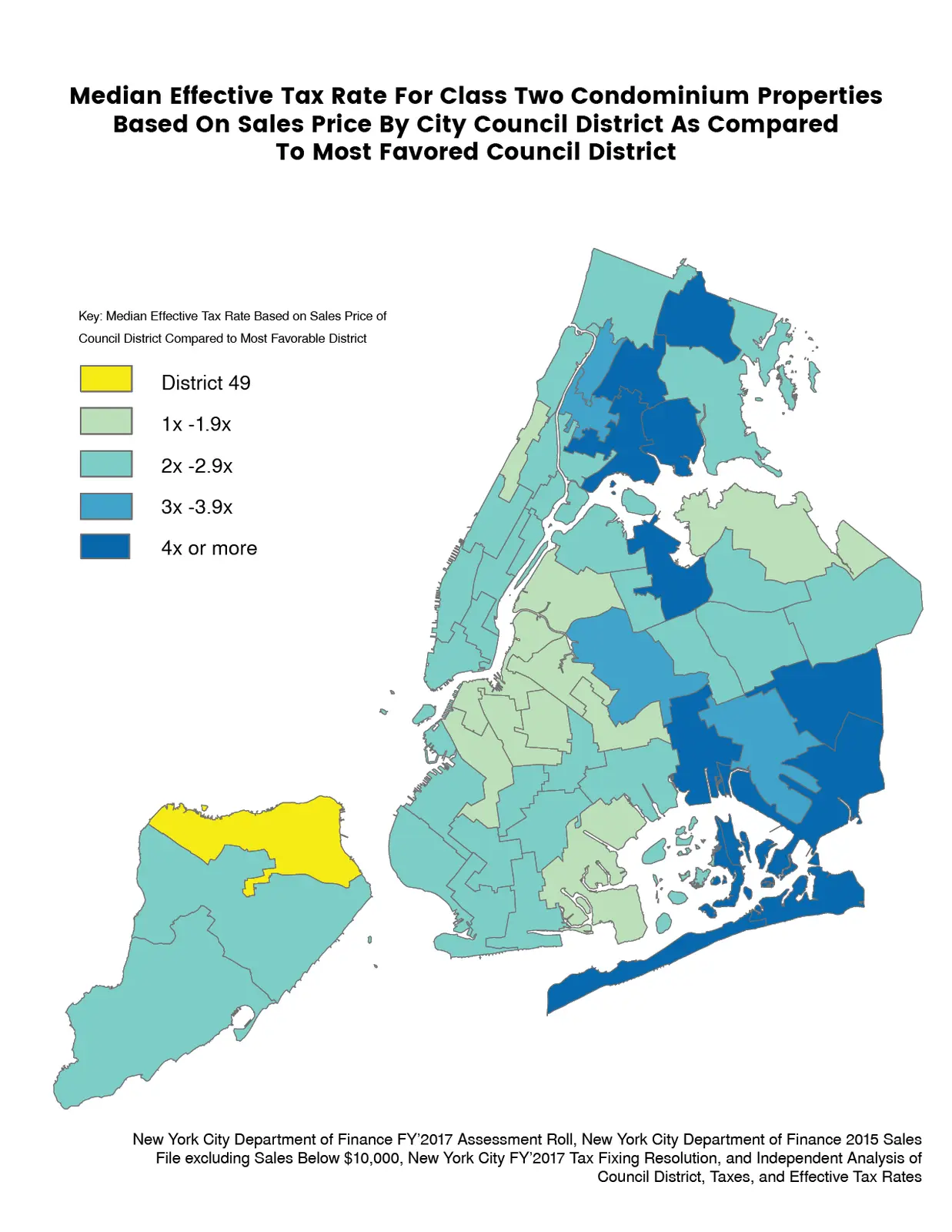 "The New York City tax system is geographically discriminatory and imposes higher effective tax rates on renters and homeowners in neighborhoods that are less affluent and contain larger concentrations of minority populations."
